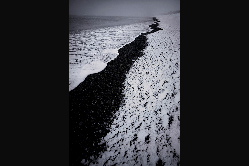 こんな風になっているだろうと思って浜に出ると、やっぱり白い世界に黒い道が出来ていた。浜は砂や小石なので雪が積もりやすい。そこを白く泡立つ波が洗い、引いてまた打ち寄せる少しの時間に、波寄せ側にどこまでも続く黒い道ができる。遠くは降る雪にかすみ、白い中に道は何キロも先で消えていく。幽玄であった。長野県の諏訪湖に冬、湖面に張った氷がまるで何かが通ったかのように遠くまで割れて盛り上がり、それが神が渡った道のように思える「神渡り」というものがあるが、ここ大磯の雪の日の、これも静かな「神渡り」を見たような、不思議な気持ちになる現象だった。