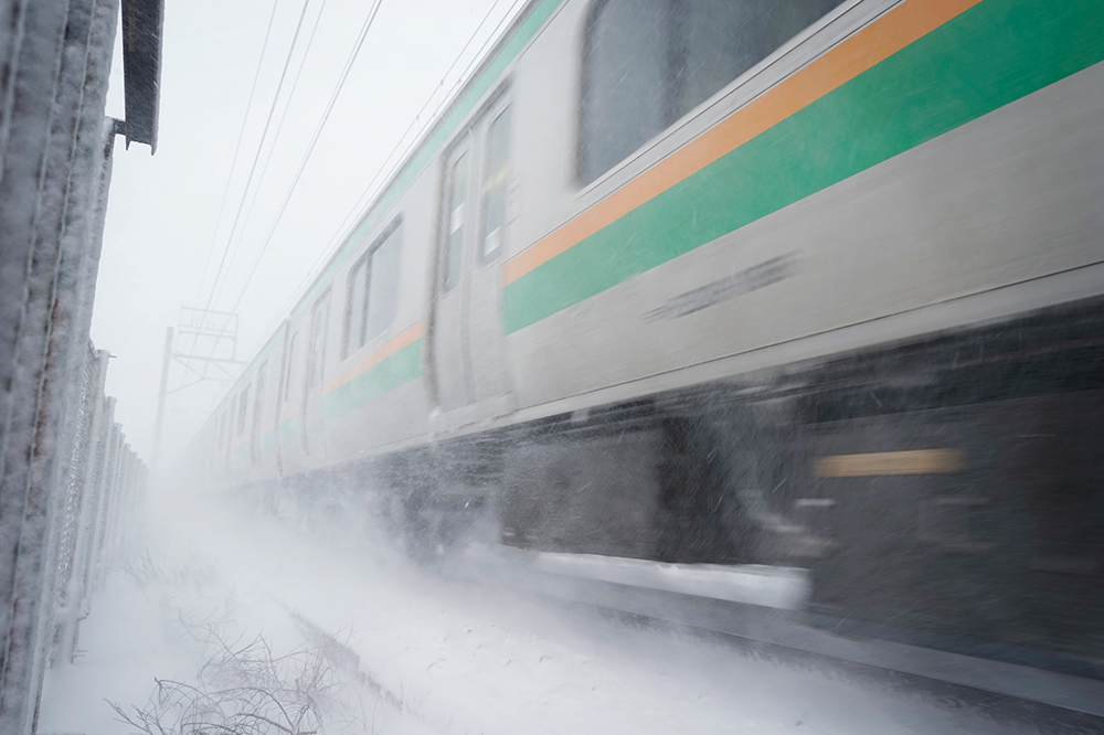 降りしきる雪を蹴立てて走るなんて、思ってもみなかっただろう東海道線のいつもの列車。これはいつものんびり走っているように見える我が東海道線の雄姿ということで、金網フェンスの間からレンズを入れて撮らせていただきました。構内に入ったりはしていません。ちょうど金網の継ぎ目で支柱がずれているのでこんな風に見えるんですね。こんな写真はルール違反にならないように気をつけて撮りましょう。