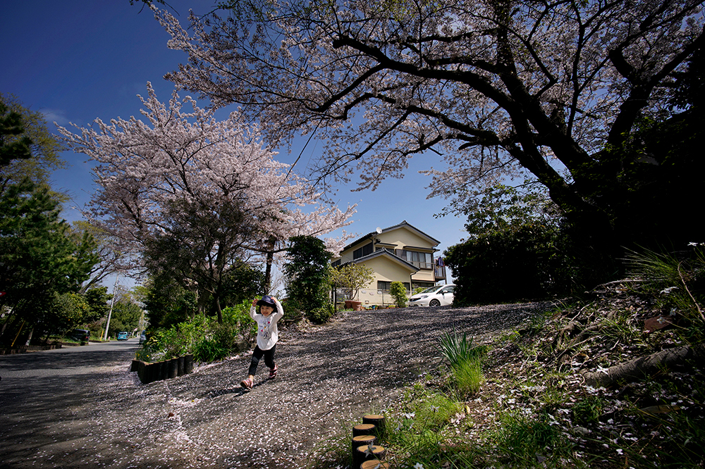 街のあちこちで桜が綺麗に咲いたので、澄み切った晴れの日、花と街と人の気配のコラボを求めてあちこちを歩いてみた。旧東海道、江戸時代はここを旅人たちが通った化粧坂(けわいざか)に広い脇道への斜面があり、そこに満開の桜が覆いかぶさって、面白い空間になっていた。しばらく待っていると、おばあちゃんに連れられた小さな少女が楽しそうに笑いながら近づいてきた。しばらくおばあちゃんと立ち話をしてから、「そこを走ってごらん。転んじゃダメだよ。」というと、あははあははと笑いながらそこらじゅうを駆け回ってくれた。あえてアップは撮らず、カメラを引いたままで、元気な少女とそれを見守り守る大人たちのような、大きな桜との小さな物語を撮った。