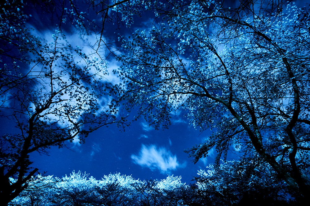 昼間行っただけではもったいないので、夜中にも神揃山に登ってみた。低い山だが一応山頂なので、夜は真っ暗。手に持った懐中電灯を消すと、だんだん目が慣れて、月に照らされた雲は白く、桜の花も白く、闇に浮かび上がってくる。なおじっと暗闇に座っていると、枝の形も見えてきた。昼間と違って、少し怖いような形に枝が伸びているように見えた。今のカメラはこれが写るのだからすごい。