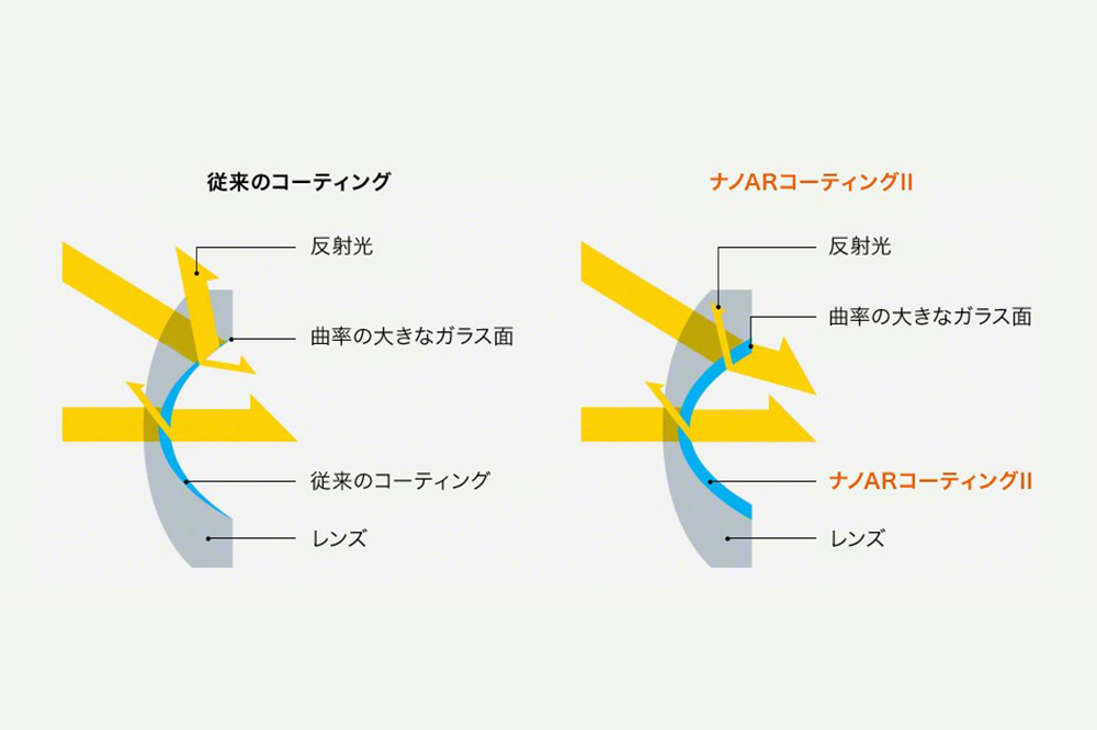 超広角かつ大口径となるため、より多くの光を取り込める一方で、従来のコーティングではゴーストの抑制や色味の補正が難しいことも分かってきました。今回の大口径のXAレンズは特に曲率が大きく、従来のコーティング加工のプロセスでは中心部と周辺部でコーティング厚の差が大きくなり、周辺部におけるゴーストやフレアの抑制効果が弱まってしまうという課題がありました。特に広角レンズは画角が広いため太陽光などの強い光が画角内に入ることも多く、ゴーストの抑制は必須です。「G Master」が目指す光学性能を満たすためには、この課題を解決する新たなコーティング開発が求められました。そのため、先ほど説明したXAレンズの開発と並行し、曲率の大きなレンズに均一なコーティングを可能にする「ナノARコーティングII」の開発も進めました。この新開発のコーティング技術の実現により、超広角レンズでありながら、高いゴースト・フレア耐性を達成することができ、画面内に強い光源が入るような厳しい逆光条件においても、高いコントラストの画を得ることを可能としています。加えて、鏡筒内での余計な光の反射を防止するために、設計段階から鏡筒構造の細部まで含めた非常に細かなシミュレーションを何度も重ね、ゴーストやフレアに対して徹底的に配慮された鏡筒構造も実現しています。
