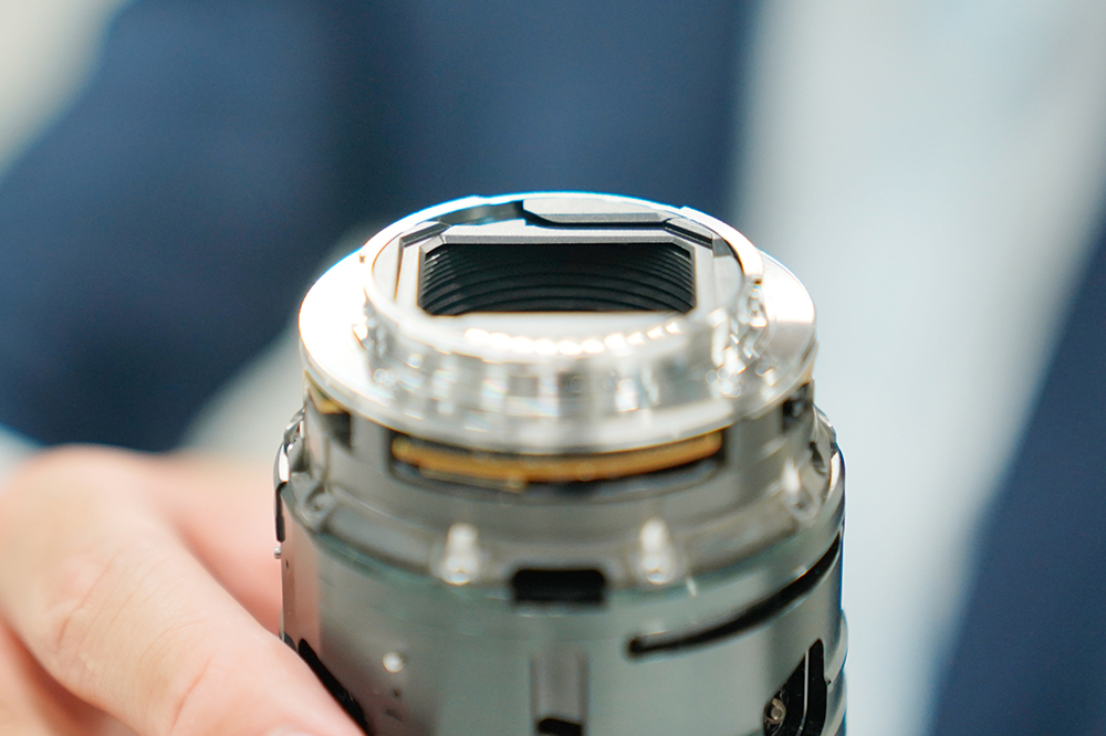 レンズの軽量化に加えて、撮影時の高いホールド性を実現させるために、前玉以外の部分をどれだけ小径化できるかも重要な開発ポイントでした。ここで大きな効果を発揮してくれたのがXDリニアモーターです。今回のレンズのような大重量のフォーカス群を動かす場合、回転型のモーターを減速して大きなトルクを発生させて駆動させるのが一般的ですが、回転型のモーターは円形や筒型の形状ですので、レンズ内に組み込むと必ず無駄な空間が生まれてしまい小径化が難しくなります。またモーターからの動力を減速する減速機構と回転を直線運動に変換する複雑なメカ機構が必ず必要となりますので、さらに小径化は難しくなります。一方でソニーが採用している独自開発のXDリニアモーターは元々直進方向の高い動力なので、直進変換機構も減速機構も必要ありません。よってフォーカス群をアクチュエーターでダイレクトに駆動することができ、最小限の部材構成を実現できます。またモーター占有スペースも円筒形状ではなく角柱型の最小限のスペースで済むため、モーターを他の部材との隙間に効率的に配置可能で、無駄のない内部レイアウトが実現でき、理想的な小径化を達成することができました。実際にレンズをカメラ本体に装着してホールドしていただくと、非常に自然なホールド性を実現しているのを感じていただけると思います。また、今回のXDリニアモーターはこのレンズのために専用設計されたモーターです。ソニーでは光学、メカ、アクチュエーターとその制御に至るまで、すべてのデバイスを内製で開発していますので、それぞれのデバイスを商品の求めるスペックに応じて最適設計することが可能です。今回のレンズの開発が実現したのも、これらの独自技術が最適な形で融合できたことが大きかったと思います。