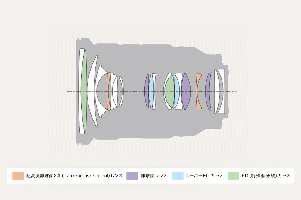 丸山:初代のレンズ構成が13群18枚であるのに対し、二代目は15群20枚とレンズ枚数が増えており、光学系としては重くなっているように想像されるかもしれません。しかし、実は光学系自体も大幅に軽くなっており、鏡筒全体の軽量化に貢献しています。初代のズーム構成をベースにしつつ、最新の技術を反映する形で、内製の超高度非球面XA(extreme aspherical)レンズを含む非球面レンズ2枚や、高い色収差補正効果を持つスーパーEDガラス、EDガラス各1枚を追加し、収差補正のバランスや硝材を抜本的に見直しています。