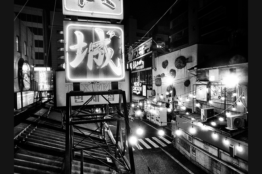 ――今回の作品はすべてモノクロでしたが、いつもどの段階でモノクロにしようと決められるのでしょうか。 森山:僕自身は基本的に撮影時からモノクロームのつもりで写しています。たまたまカラーで面白いのがあったらカラーにしますが、今回も最初からモノクロのつもりで撮りました。モノクロームの夜景が好きなんですよ。もちろん、歌舞伎町に行くと派手な看板があったりして、それはそれでカラーでも面白いんですけどね。基本的にはいつもモノクロの感覚で撮っています。 ――そうなんですね。寄ったり引いたり、ズームも使われて撮影されていますが、好きな画角などあるのでしょうか。 森山:好きな画角というより、昼間の新宿の人波でも、直感であっという間にズーミングして撮っちゃう。バッと全体を一瞬で撮って、サッとズームで寄って撮れる面白さ。というか、面白いというよりカメラが有能だよね。何かを撮ろうっていうときに、周りが邪魔だなと思ってズームしたり、逆にごちゃごちゃしている街の感じがいい場合もある。ズームはそういう感じでフレキシブルにできるのがいいよね。