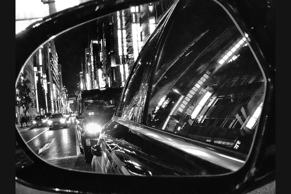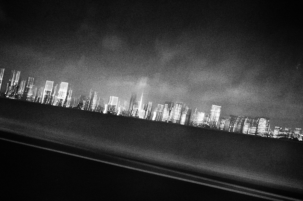 ――車窓からの都市風景と言えば、1960〜70年代の「On the Road」や「国道シリーズ」、「何かへの旅」など、写真集『狩人』(中央公論社、1972年)に収録された作品を彷彿とさせますね。 森山:そうですね。昔はよく四日市で夜のコンビナートを撮ったり、中平卓馬と一緒に川崎のほうに行ったりして夜景を撮っていたね。中平は夜景が好きで、車の中からも撮ったりしていたので、その頃のこともフッと思い出したりしたね。 ――今も車窓から撮られることはありますか?歩いて撮るときとの、意識や所作の違いなどはあるのでしょうか。 森山:歩いて撮るから車窓からはあまり撮らないけど、でも今回は車窓からが面白いなと思ってね。歩いて撮ると、すれ違う人、すれ違う街角、みたいなものに目が行ってそれを撮るよね。でも車から撮ると、立ち止まって路地を撮るとか映画館の前で撮るとかじゃなくて、流れる感じがいい。その流れる風景に感応するものがあって。しかもそれが夜だと、セクシーというか、エロティックというか、かっこいいんだよ。フロントガラスに映る、僕の目に映る、その擦過する瞬間がいい。撮るのは一瞬で本当に撮れたかわからないくらいなんだけど、その瞬間、網膜に映るイメージはいつまでも残るよね。