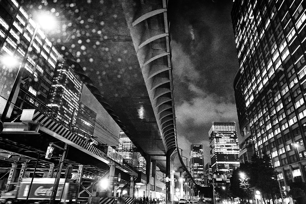 ――今回、オンラインギャラリーで見せていただく撮りおろしの作品は、森山さんの事務所がある新宿からご自宅がある逗子までの帰り道で撮られたものと伺いました。 森山:そうだね。基本的には東京都内の都市の夜景を、車の窓から撮った写真です。新宿、渋谷、銀座など、ルートを決めて行ったわけではなく、久しぶりに新宿の夜景を見ようとか、逗子へ帰るときに必ず通る渋谷とか、湾岸沿いの夜景とか、なんとなく行った先で撮った写真だね。