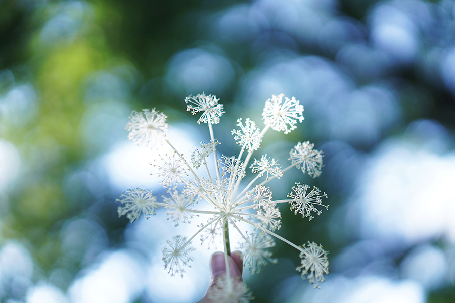 空はすっかり曇ってしまったので、川以外で撮れるものを探していました。そんな時に見つけたのが、この水たまりです。川の淵にある水たまりも水がとてもきれいで、「雲と空がいい感じに映っていて素敵だな」と思い撮影しました。水に映っている人物のシルエットは黒く潰れそうなところですが、ワンピースが白いことまでわかるので「これはすごい」と思いましたね。 下の作品は、仁淀川からの帰り道で見つけたレースフラワーです。繊細な白い花に魅せられて道ばたに咲いていた花を摘み、緑と光がある背景を選んで撮影しました。この旅ではツァイスレンズ「Sonnar T* FE 55mm F1.8 ZA」を使っていますが、この作品も私が好きなツァイスらしい描写です。
