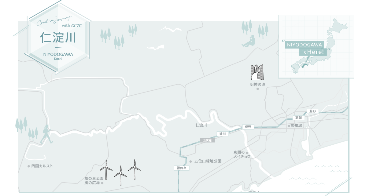 今回はα7Cを持って、高知県と愛媛県を流れる「仁淀川」を撮りに1泊2日の旅に出かけました。透明感が高い「仁淀ブルー」と呼ばれる神秘的な青色を、私の視線で表現してみたいと思ったんです。仕事で一度訪れたことがありますが、「まだ知られていないところが撮りたいな」という思いがあり、予備知識や事前情報は一切入れずに、仁淀川の中でも行ったことがない場所を探しに行ったのです。