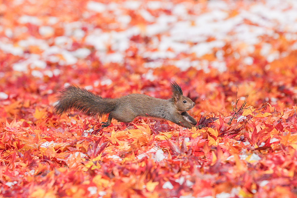 紅葉が最盛期を迎えたタイミングで、雪が降りました。足元に広がる、秋から冬へ移り変わろうとする景色だけでも十分に作品になりそうな美しい日でした。そんな中、エゾリスが冬支度の餌探しで忙しなく走り回っていました。写真ではなかなか伝わりにくいのですが、そのスピードはまさに茶色の閃光。全速力で目の前を横切っていく彼らを捉えるのは、至難の業です。こうしたシーンには、二つの難しさがあります。一つは高速で動く被写体をファインダー内に捉え続けること。もう一つは、その動きにピントを合わせ続けることです。α7 Vのブラックアウトフリーでの連続撮影は、ファインダーが暗転しないため、肉眼で見ている感覚のまま被写体を追い続けることができました。さらに、進化したリアルタイム認識AFがエゾリスの瞳を正確に捉え続けてくれます。もちろん前後のカットもピントが合っていました。「あんなに速い動きが、こんなに簡単に撮れちゃった」。α7 Vの性能の高さに、改めて驚かされました。