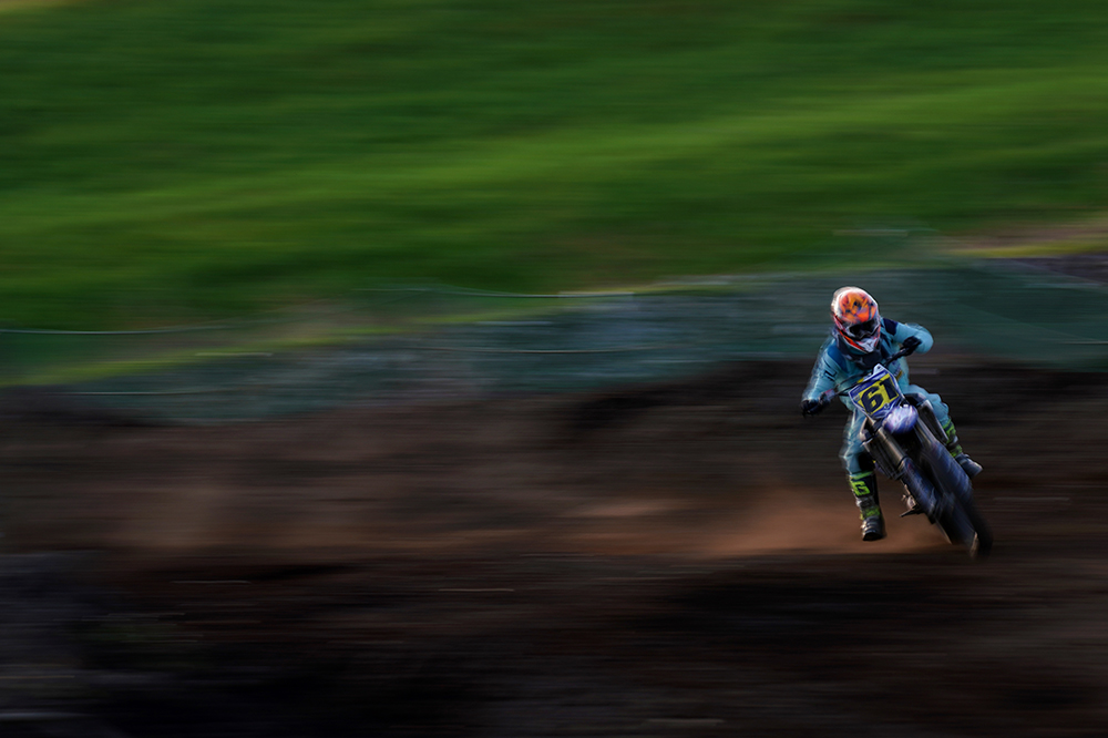 向かってくるバイクをとらえた一枚です。上下運動が激しいので通常はスローシャッターで撮るのは無謀、ボツ連発のはずですが、上手に撮れました。10コマ/秒の連写モードでささっと撮影しましたが、これが秒4〜5コマだったら苦しいでしょうね。すべてAFで撮りましたが、このシチュエーションだとフォーカスよりも、ライダーとバイクの不規則な動きに同調できるかがポイントになります。