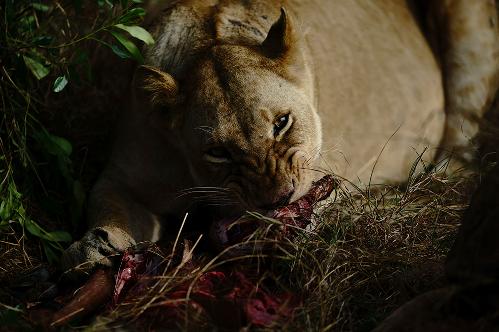 夜のうちに狩りが終わっていたようで、朝一でメスライオンが食べているところに遭遇しました。ライオンの恐ろしさが感じられる表情と目を引き立てたかったので、ギリギリまで近寄って浅い被写界深度で撮影した作品です。煩雑な構図ではありますが、うまく前後をぼかして目だけが浮かび上がるような状況をつくれたのはF2.8の力です。 むさぼり食っている状態ですが、カメラを構えたときに反応して、グッと怒りの表情を浮かべた瞬間ですね。ぜひ目の部分を拡大して見てください。このレンズはシャープなだけでなく透明感がある写りをするので、目のクリアな感じもうまく出すことができました。
