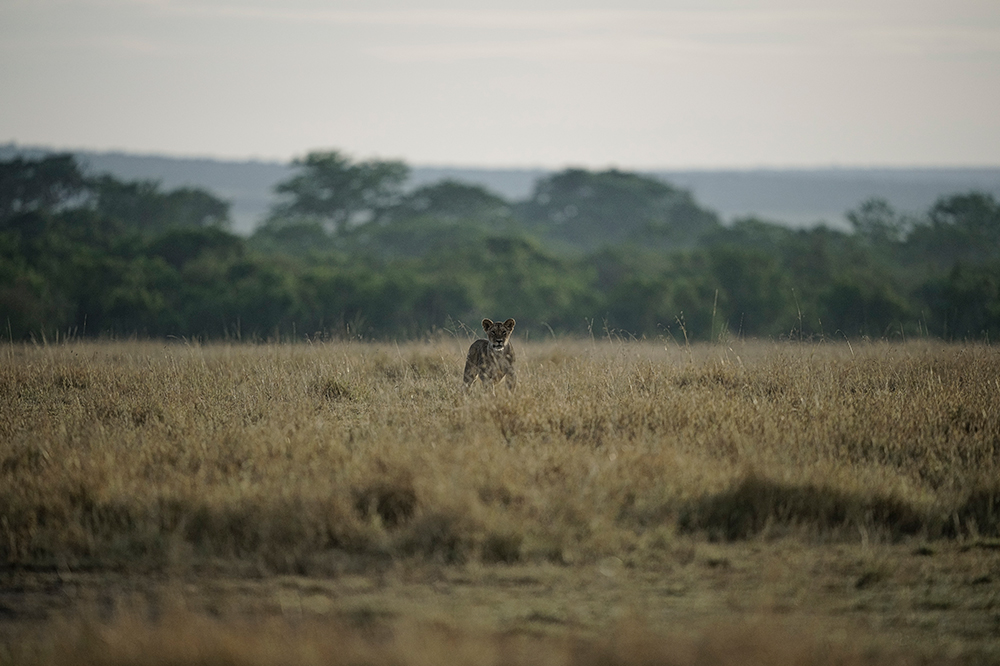 小さなライオンが母親に甘えているシーンですね。先ほどご紹介した格闘しているライオンと同じ群れの親子です。実はこれも今回の撮影で狙っていた1枚。野生動物の生活は厳しいだけではなく、日々の暮らしの中でこういった優しく穏やかなひとときもあります。命あるものですから、人間と同じようにこういうシーンがあることもぜひ伝えたいと思って狙いました。 草が密集したところにいましたが開放のF2.8で撮影し、前景も背景もきれいにぼかすことができました。もしF5.6やF8で撮影していたら、草がもっとくっきり写ってしまってざわざわした感じになってしまうと思います。ライオンが草に埋もれることなく、大口径らしいぼけの大きさとシャープさの対比をうまく出すことができました。 ぼけとシャープさを両立できているから、この奥行や立体感が出せる。さらに母親と子どもの毛の硬さが違うことも感じさせる、描写力の高いレンズだと思います。