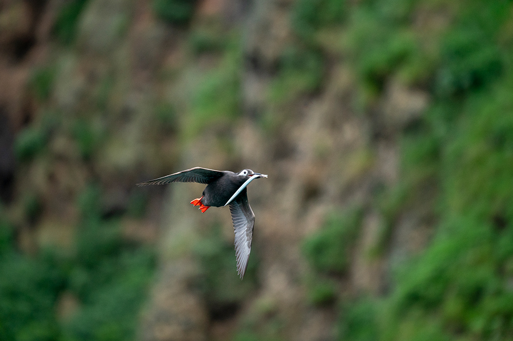 上の作品もISO6400で撮影したものです。海から急上昇してきたケイマフリを、断崖の上から見下ろした状態で狙いました。下にいる時からコンティニュアスAFでピントを合わせ続けていましたが、被写体が画面の端にきてしまっても逃さず捉えてくれました。α9はAFエリアが広く、主役である鳥を自在に配置できるのも魅力です。