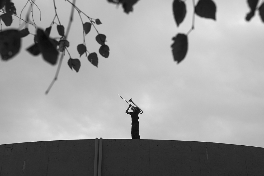 長野県の小海町高原美術館で写真展をやらせてもらった時、遊びに来ていたトロンボーン奏者の東條あづささんにお願いして撮らせてもらった作品です。美術館の屋上に連れ出して、風景の中で演奏している様子を撮影しました。 ポイントは手前に入れた白樺の葉。風景写真の場合は作画の時に「近景、中景、遠景」という三拍子が揃うと空間に奥行きが出ると言われています。それを意図的に入れて構図をつくりました。近景は白樺の葉。中景が人物、遠景が雲です。この3つがあると、人は安心するんですよね。 ポートレートを撮る時は、頭上に空があると希望が写り、靴まで写すとリアリティが写るというのが僕の持論。ハイヒールを履いているのか、スニーカーなのか、想像させるためにあえて見えないように撮りました。さらに、横位置は状況を述べる、縦位置にすると人の本質に迫る、と思っています。今回は状況を強調し、広くとった空に音を届けるかのように、楽器を上に向けてもらいました。天候が変わりやすい山あいにあるため、雲のグラデーションもいい感じです。 ここでは、コーラス隊を並べたり、女の子に1人でポツンと歩いてもらったり、元野球部の男の子に投げるポーズをしてもらったりと、モデルを変えつつ、いろいろな構図で撮りました。そのくらい被写体を選ばずにいい写真が撮れる構図ということですね。ですから「幸せの構図」ということで、小海町のフォトスポットにしたらどうかと提案しているんですよ(笑)。