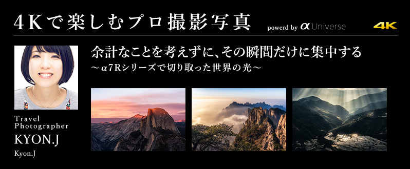 残念ながら中止になってしまったカメラと写真映像のワールドプレミアショー「CP+2020」。ここでは、ソニーブースのスペシャルセミナーで講師のみなさんが伝えたかった思いとともに、セミナーのための撮り下ろした珠玉の作品群をご紹介します。今回は、α7Rシリーズを使って世界の絶景を撮りつづけているトラベルフォトグラファーのKYON.J氏が登場。カメラの進化とともに自身の撮影スタイルも変化してきたこと、そして、撮影時に頼りになるカメラの機能について語ります。
