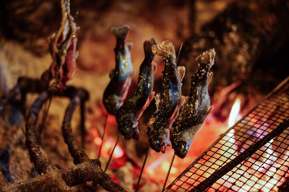 囲炉裏で焼いている川魚を店内で撮影。かなり暗い場所だったが高感度性能が良く、燃える火を逆光に魚の立体感を表現できた。