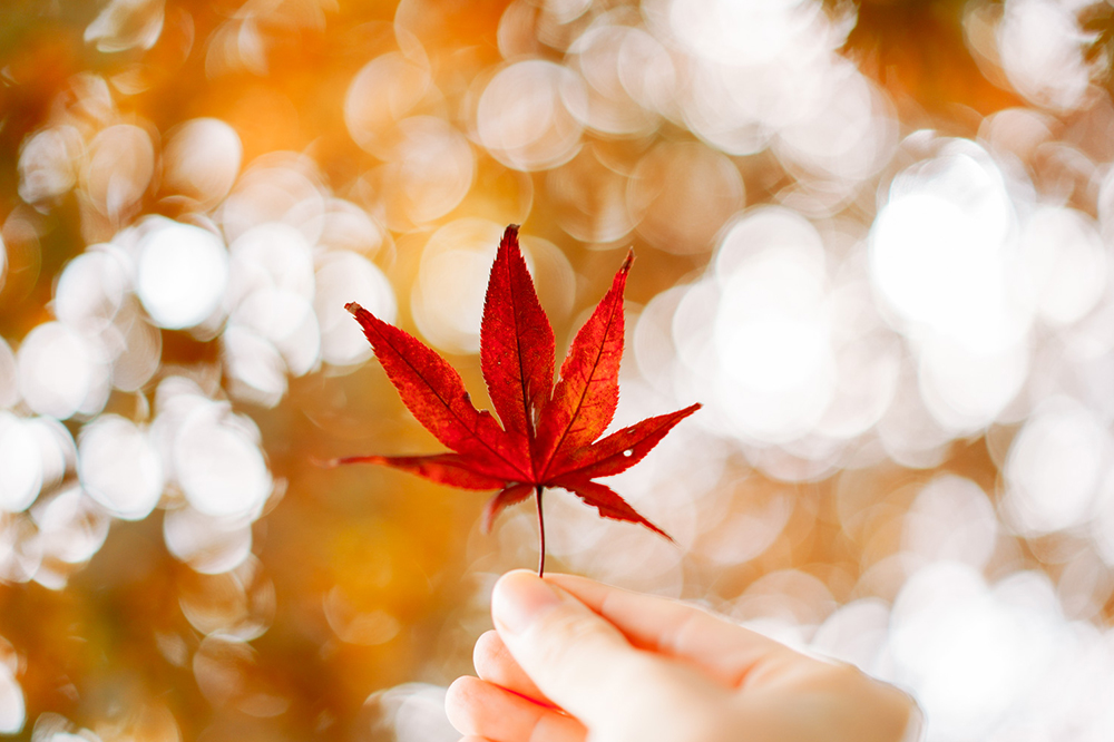 美しい玉ぼけがモミジの葉を引き立てていて、本当にきれい。旅先ではほとんど三脚を使わないので、この時も手持ちで撮影しています。F1.8ではピントがシビアになりますが、5軸ボディ内手ブレ補正のおかげでブレることなく撮ることができました。