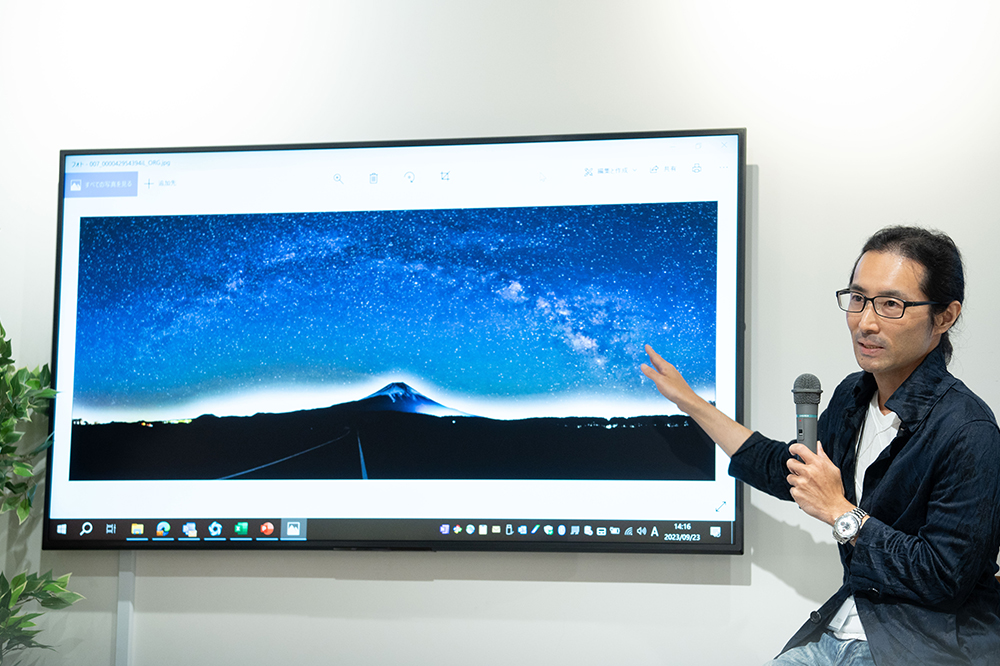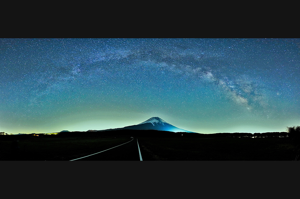 bushi:3月から4月頭くらいに朝霧高原で撮った作品です。このように星空を撮る時にはいくつかの条件があります。まずは天候。とにかく雲があると撮影できないので雲がない日を選びます。あとは月が出ていないこと。星は光が弱いので、月の光があるときれいに写りません。そして、地球は自転や公転をしているので、この風景は3月4月くらいにしか見ることができないわけです。この条件が重なった時を狙って撮った1枚になります。見ていただくと縦横比が普通の写真と違うことがわかるかと思いますが、実はこれ、写真を縦構図で少しずつずらしながら8〜9枚撮影して合成した作品なんです。ですから合成することを念頭に入れて撮影し、合成により完成させた1枚になります。