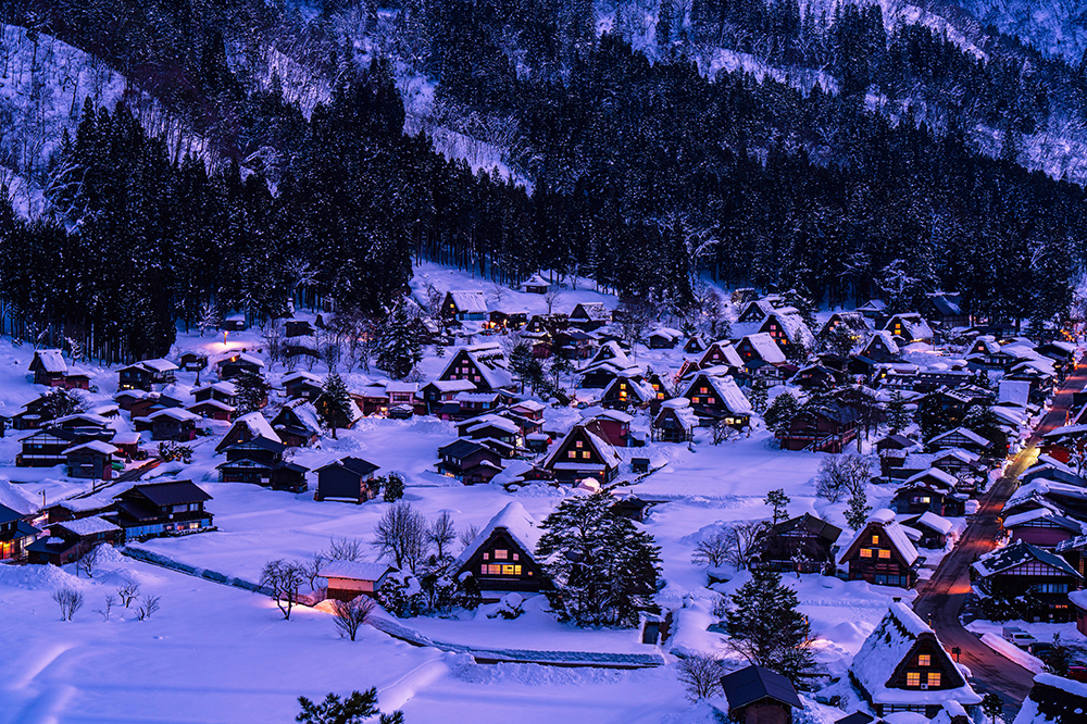 RC F:1月23日、この日は今シーズンで一番雪が積もったのではないかとホテルのオーナーさんから聞きました。そのくらい豪雪の時に撮影したものです。白川郷にはライトアップイベントがあるのですが、展望台はチケット制になっていて、抽選で当たっていたんです。でも10日ほど前にコロナ感染予防のため中止、という連絡がきました。ですからライトアップはしていないのですが、展望台まで行って撮影した1枚になります。夕暮れ時から、ライトが点灯したところを撮ろうと思って、ホワイトバランスを少し変えて撮影しました。冬なので少し温かみを入れながら、青っぽい方向に調整しています。展望台に着いた時はまだ雪は降っていませんでしたが、帰り際に少し雪が降ってきたのでストロボを使って撮影。雪の玉ぼけを入れながらの白川郷を撮ることができました。αcafeにはあと4枚ほどここから撮影した写真をアップしています。パッと見は、24mmから35mmくらいの広角で撮影しているように見えますが、撮影したのは89mmなんですよ。