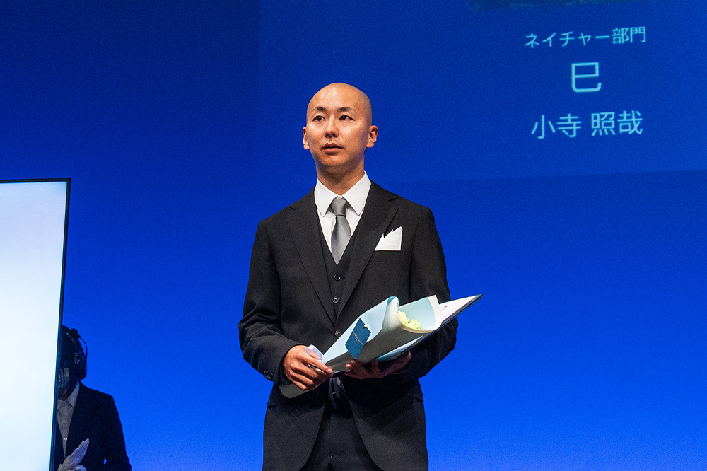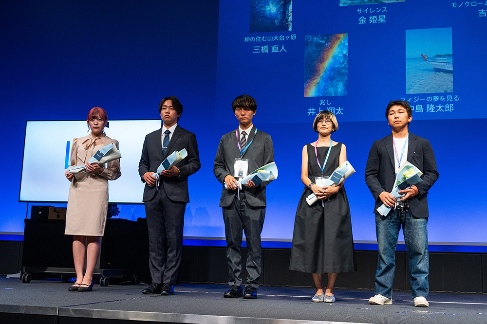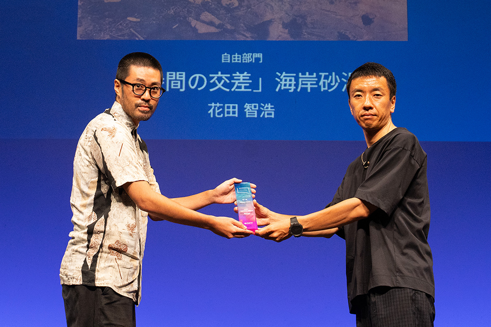 まずは写真作品のグランプリからの表彰。スポットライトで会場がきらびやかに演出され、受賞者名、作品タイトルを発表。ステージ上の大スクリーンには受賞作品が映し出されます。そして、グランプリを受賞した花田智浩さんがステージに登壇し、審査員の石川氏からトロフィーと表彰状のほか、副賞のフルサイズミラーレスカメラ『α7R V』が手渡されました。