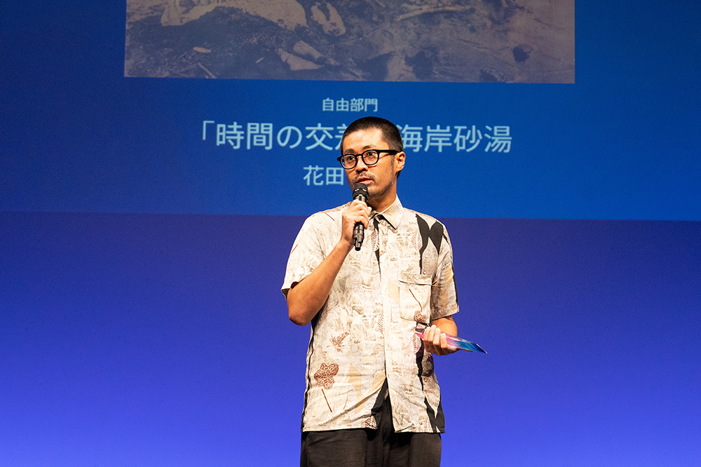 花田さんは『時間の交差 海岸砂湯』という作品を自由部門に応募し、グランプリを獲得。ステージ上では、受賞の喜びや作品制作時の葛藤などを語りました。