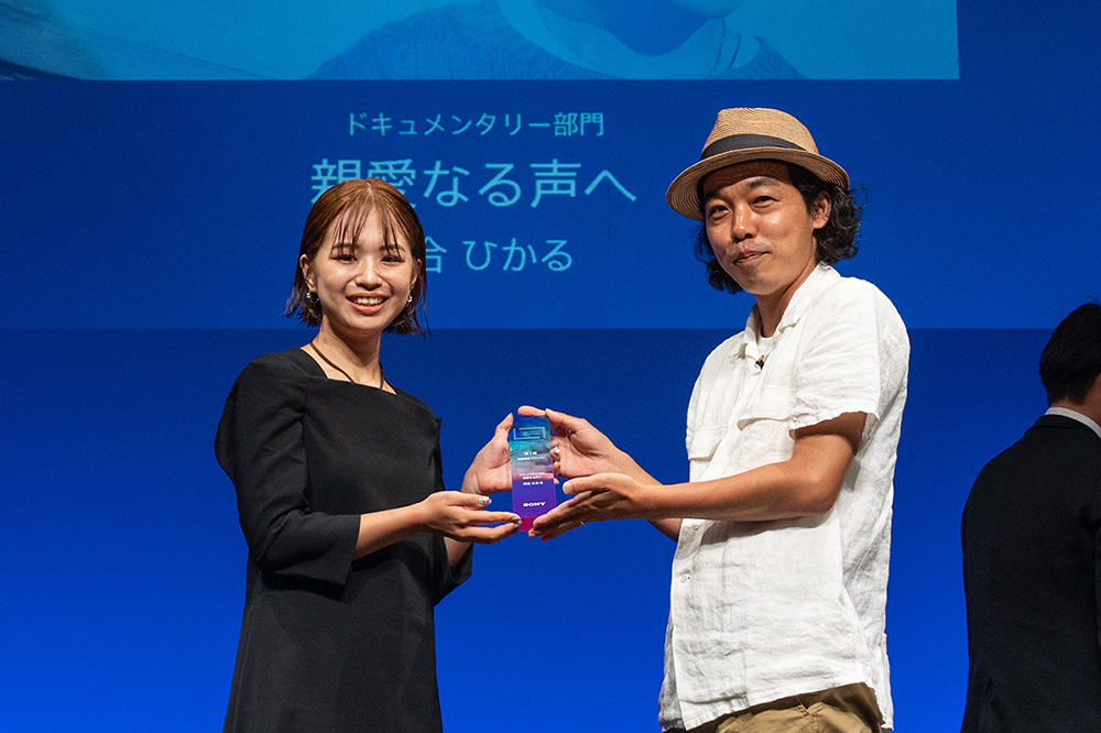 「この作品を制作しようと思ったのは、大分県別府市がアーティストやクリエイターを支援するために居住・制作の場を提供する『清島アパート』に参加した2022年のことです。その時に温泉は 50年前の雨水であることを知りました。つまり、雨水が大地に染み込み、地熱によって温められて温泉になるという過程を知った時に、時を感じるような作品を制作したいと思ったのです。しかし2022年時点では、別府という土地を取り上げるのはあまりにもベタすぎるのではないか、50年前の写真を使った作品表現はいかがものか、といろいろな思いが交錯しました。しかし、2024年に別府市が100周年を迎えた時、100年前の写真を使って過去と現在の比較する意義を見出すことができ、作品制作に取り組むことになりました。制作にあたり、写真や絵はがきを貸していただいたり、作品で活用した温泉染めを教えていただいたりと、別府の人たちにはたくさん助けていただきました。その結果グランプリをいただくことができたので、僕 1人では成し得なかったと思っています」続いては、映像作品グランプリを表彰。受賞した河合ひかるさんが登壇し、審査員からトロフィーと表彰状、副賞のシネマカメラ『FX3』が贈られました。