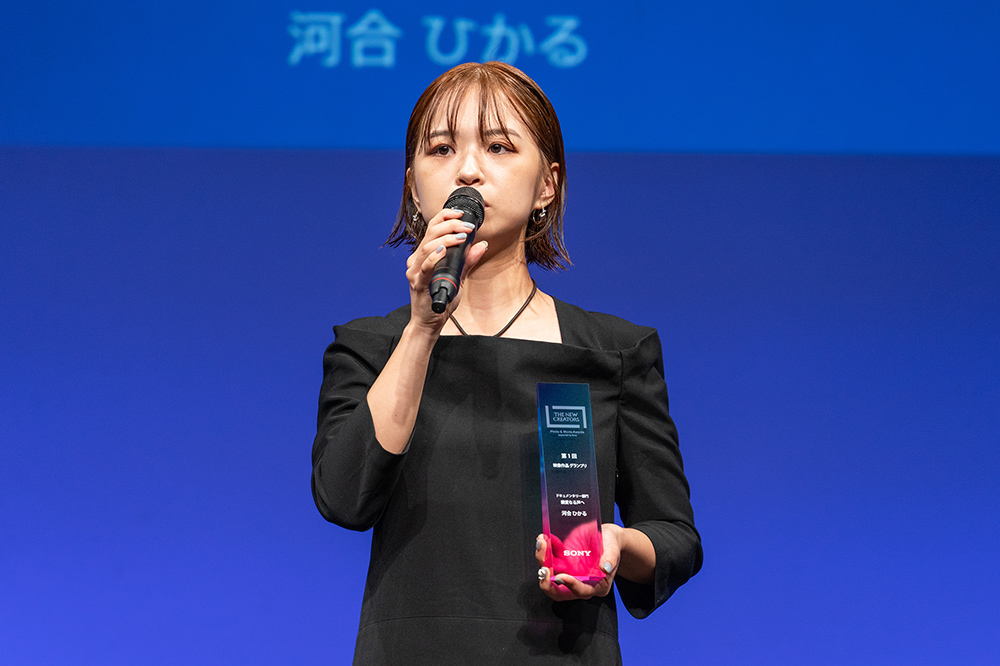 河合さんは『親愛なる声へ』という作品をドキュメンタリー部門に応募。マイクを渡されると「この場に来てもまだ実感が湧かない」と話す河合さん。続けてご自身の生い立ちや作品に込めた思いなどを話します。