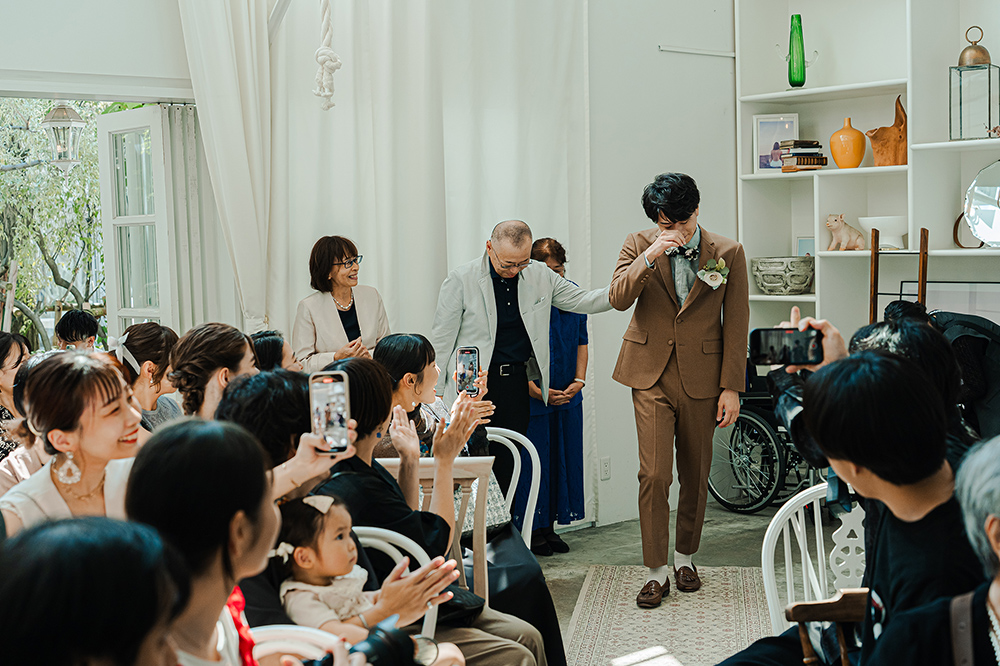 囲まれた空間の密度感と、感情の滲みが印象的でした。手前の参列者の表情や感情を活かしてレイヤーを作り、新郎の想いが浮かび上がるよう構図を意識しました。光の回り方にも助けられた一枚です。