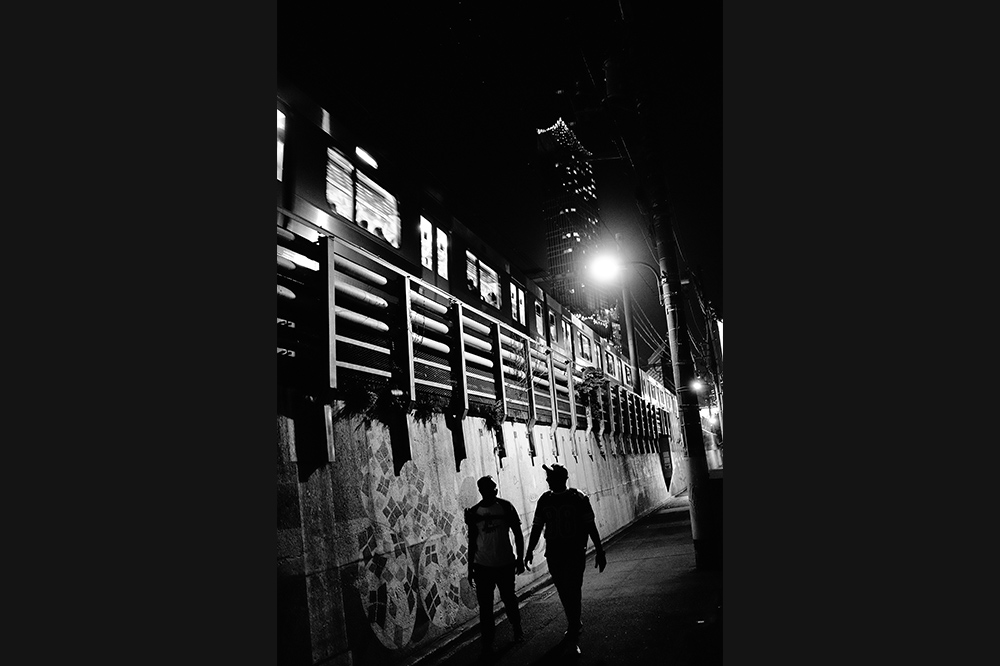 エスニックタウン、大久保で撮影したこの作品では、電車が通過する瞬間の光を活かし、敢えて二人の男を黒く潰してシルエットとして表現しました。モノクロ作品における白と黒とは、すなわち光と影だと思います。色彩の情報をシャットアウトして光景を光で捉え、影で描くのがモノクロならではの醍醐味です。一般的に50mmレンズが標準レンズとされていますが、被写体を切り取る感のある50mmよりも、その場の状況も捉える35mmこそがスナップにおける標準レンズなのではないかと思います。