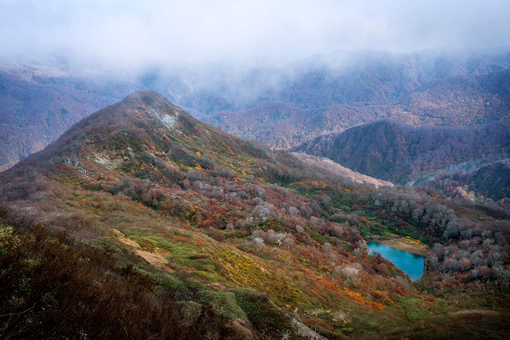 月山は山頂に月読命を祀り、仏教では阿弥陀如来を本地仏とする。また古代から死者との交信場所として信仰されてきた。1日目には、月山スキー場の姥沢駐車場から夜明け前に登り始めた。鬱蒼とした森を抜け谷を登り、森林限界を超えると荒涼とした瓦礫の世界をひたすら真っ直ぐ登る。振り返るといつしか雲の上に出ている。6時間かけて山頂に着き、日が沈むまでそこにいた。二日目は羽黒山口8合目から、今度は東斜面の谷「東補陀落」に向かった。そこでも長い時間を過ごし、8時間後に8合目の駐車場に戻った。写真はその時、ちょうど夕日が沈むマジックアワー。山頂に着いたからといって、そそくさと撮影してさっさと降りて行きたくない。苦労して谷に下りたら、やはりそこで時間を過ごしたい。そうするとだんだん見えてくるものがあるのだ。