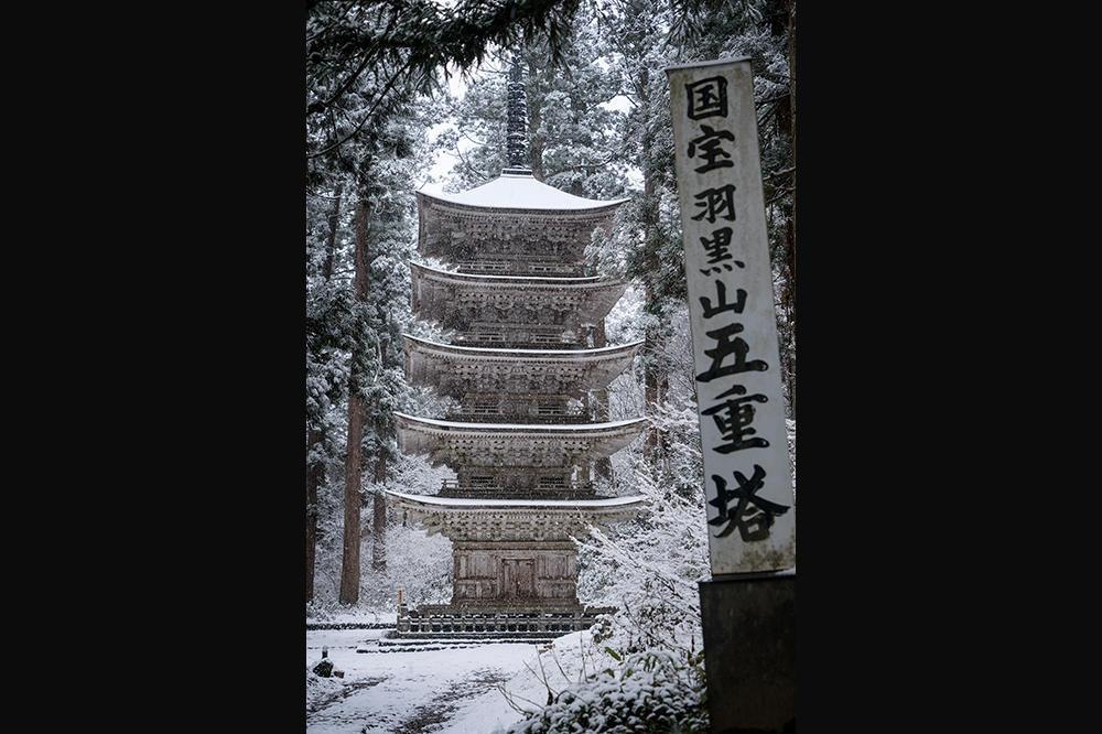 羽黒山山頂には出羽三山神社があり、冬には入ることができない月山や湯殿山を合わせて三神合祭殿に参拝できる。ふもとの山門から、2446段の石段を登って山頂の祭殿に至る。途中にある国宝、羽黒山五重塔は平安時代の創建とも言うが、現存するものは14世紀に再建された。高さ30m弱で、全く彩色されない素朴な塔である。雪の日には白い地面の反射光で軒下の精密な木組みまでよく見ることができる。雪を待って五日目、ついに初雪が降った。宿の主人も近所の商店の女性も「降りましたね~。よかったですね~。」と言ってくれた。絶対写真を失敗できません。
