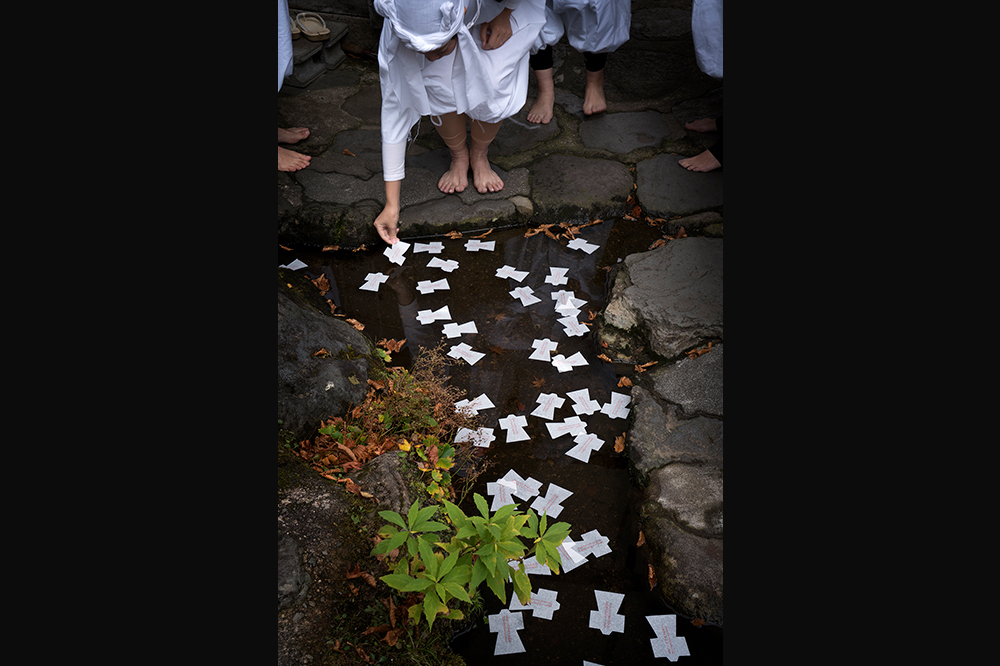 湯殿山神域に上がると、今も数多くの参拝者がおとずれている。ここには巨大な御神体があるが、それについては昔から「聞かば語るな、語らば聞くな」と言われ、話してはならないことになっている。神域の撮影許可は頂いたが、御神体の写真はお見せしない方がいいだろう。参拝者はその行った者だけが会える御神体のある神域に入る前に、裸足になり、人型の紙に自分の汚れを移して水に流す。