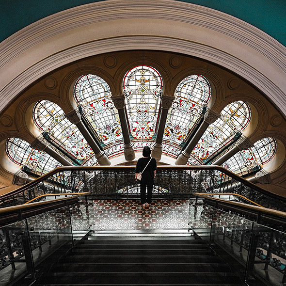 [QVB]シドニーの中心地、歴史あるクイーンヴィクトリアビルディングは建築物として美しい。扇形のステンドグラス前で20mmだからこそ、この画角に収まった。