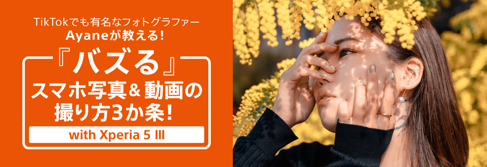 TikTokのフォロワー数は約85万人!スマホ世代からも絶大な支持を得るフォトグラファーAyane氏が、CP+2022ワークショップ登壇に合わせて特別に、Xperia5IIIを使ったバズるスマホ写真・動画の撮り方三か条をご紹介します!実際に自分のスマートフォンでもトライしてみよう!