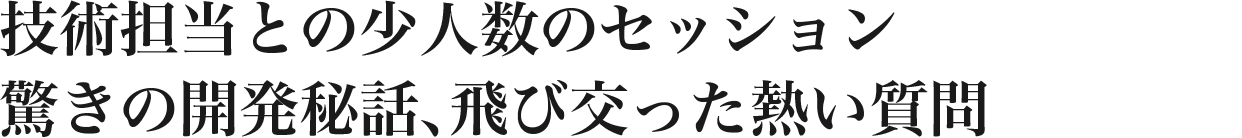後半は、「αの誇る技術力」と題し、50人が十数人ずつの3グループに分かれ、イメージセンサー、プロセッサー、レンズについてそれぞれ別室で、ローテーションしながら各グループの皆さまに技術的背景や開発秘話をお話しし、質疑応答を行うセッションを行いました。