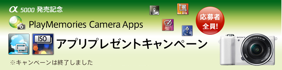 「α5000 PlayMemories Camera Apps アプリプレゼントキャンペーン」(以下「本キャンペーン」といいます)では、キャンペーン期間内に対象商品をご購入し製品登録をおこない、募集要項にご同意のうえご応募されたお客様にもれなく、以下の賞品をプレゼントいたします。