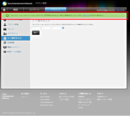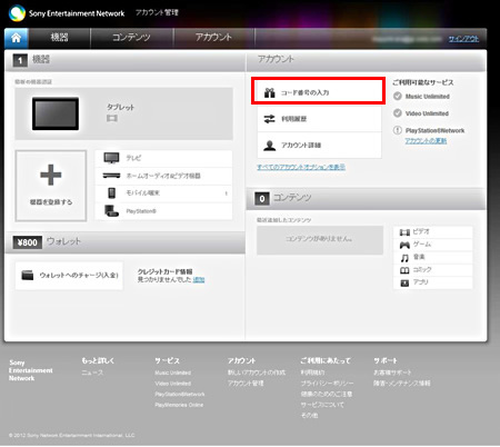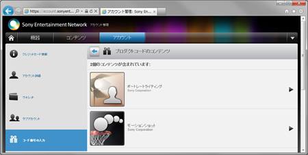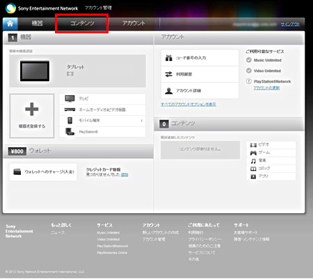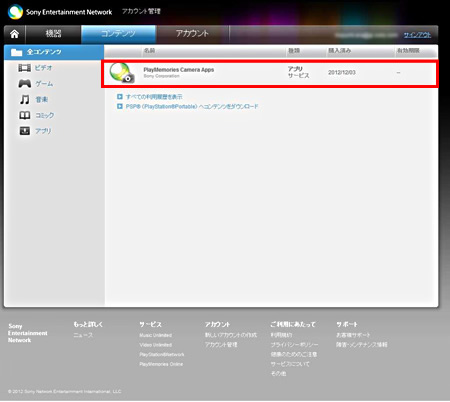 コードが登録されているかどうかは、アカウント管理画面の「コンテンツ」のタブをクリックして「PlayMemories Camera Apps」のアプリが登録されているかを確認します。