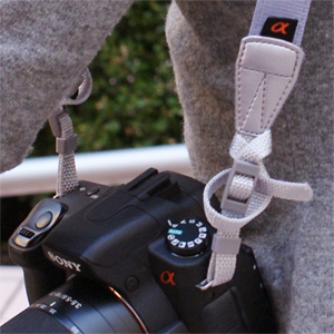 でも"α350"や "α300"のライブビューを使って撮影する場合は、首からストラップをかけていると撮影しづらくなりますよね。そういうときはストラップを首から外しますが、そのままではストラップがジャマになったり、カメラを落とす危険もあります。そんなときストラップを手に1回巻いて持つと、液晶を見ながらでも落下しにくく楽に撮影できます。