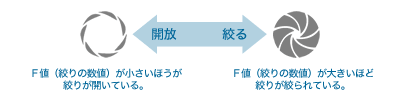 ここで使用したレンズは、絞りを最大限に開いた状態のF値が2.8となります。レンズの種類によって、絞りを最大に開いたときと、絞ったときのF値は変わります。F値を小さくすると絞りが開いてピントが合う範囲が小さくなり、ボケ具合が大きくなります。目安にしてください。F値を小さくして、絞りを最大限に開くことを「開放」と表現します。