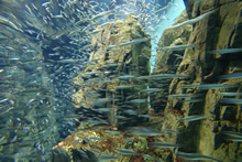 水族館での “鰯” の回遊。11mmの超広角と強調された遠近感により、狭い水槽を感じさせないくらい、 “鰯” のスピード感と躍動感を表現できた。