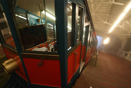 急須面のケーブルカーの駅のホーム。11mmの遠近感とワイド感により、ケーブルカーと急斜面の階段ホームの雰囲気がさらに強調される。たちこめた霧により、幻想的な写真になった。