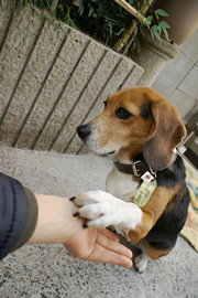「お手」をしているところを広角18mmで撮る。構図を斜めにすることでイヌの手と人間の手のコミュニケーションが良くわかる。