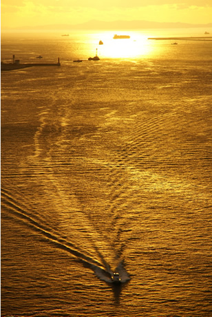 黄昏の海と船のシルエットがとても印象的だった。 |