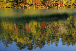 色づいた木々が、湖面にどう映っているかにも注目してみましょう。