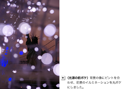 夜空の部分が多い場合とは逆に、イルミネーションなどが画面の大部分を占める構図では、カメラは「明るいものがあるので露出を抑えよう」と判断します。私たちの目は「明るくて綺麗なもの」として認識していますから、このイメージを写真で表現するには、露出をプラスに補正する必要が出てくる場合があります。マイナス補正の場合よりも補正の幅を大きく、プラス2近くまで補正するケースが多くなります。 |