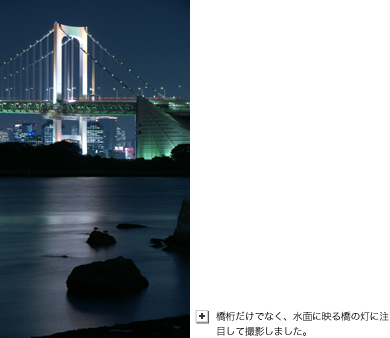夜の街には、夜景やイルミネーション以外にも魅力的な被写体がたくさんあります。水面に映りこむ夜景や、暗がりにも目を向けてみましょう。また、遠景だけにとらわれず、近くにあるモノや風景を主役にして、遠景と組み合わせて撮影していくと、「夜景」にバリエーションが出て、撮影がずっと楽しくなってきます。