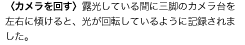 露光時間中に、ズームレンズのリングや三脚の雲台を動かして、光跡を描いてみましょう。露光時間の長い夜景撮影ならではの楽しい効果です。