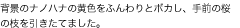 あれもこれもと欲張りすぎると、主題のはっきりしない写真になりがちです。「桜をメイン」にと決めたら、脇役となる要素は抑え気味に配置します。いちど脇役として入れようと思ったものでも、やっぱり入れないことにしよう、という判断もあるでしょう。