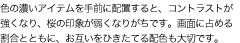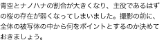 同じ風景を撮影してもそれぞれ個性が出るのは、風景を占める要素と配色にあります。「あ、きれい」と心のおもむくままに撮影するのも1つの楽しみかたですが、何をどれくらいの割合で画面に入れるか、じっくりと計算しながら絵づくりするのもおすすめです。主役を「桜」に決めたら、組み合わせるアイテムはあくまで脇役。主役と脇役が逆転してしまわないよう、バランスが大切です。