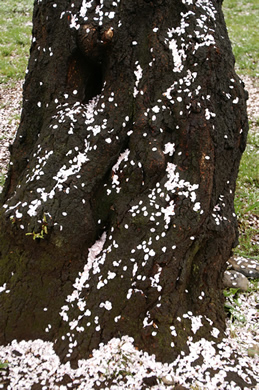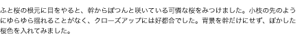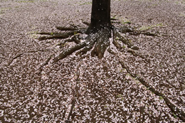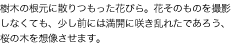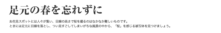 咲きほこるのも桜なら、おしげもなく散りいそぐのも桜です。満開の枝ばかりではなく、足元にも目をむけて観察してみましょう。桜の木や花そのものを構図に入れなくても、その写真を見た人が、「桜」のイメージを膨らませることができれば成功です。